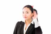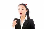 Asian young woman dressed up as a devil with making stop gesture sign from both hands isolated on white background