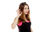 Asian young woman dressed up as a devil and making frame with fingers isolated on white background