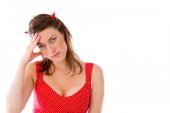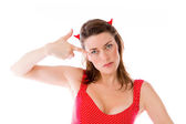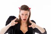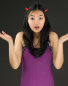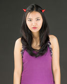 Asian young woman dressed up as a devil and looking frustrate isolated on white background