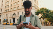 Portret młodego Afroamerykanina w jasnoniebieskim t-shircie siedzącego na ławce w parku miejskim i korzystającego ze smartfona. Facet ogląda zdjęcia, filmy w telefonie komórkowym. koncepcja stylu życia.