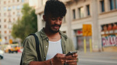 Zbliżenie portret młodego Afroamerykanina w jasnoniebieskiej koszulce za pomocą smartfona. Mężczyzna patrzy na zdjęcia, filmy w telefonie komórkowym.