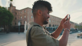 Zbliżenie młodego Afroamerykanina w niebieskiej koszulce, siedzącego na ławce w parku i mówiącego przez głośnik. Uśmiechnięty mężczyzna wysyła wiadomość głosową przez telefon komórkowy. koncepcja stylu życia.