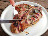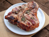 Biała okrągła płyta z grillowanym stekiem T-bone izolowanym na drewnie rustykalnym
