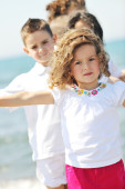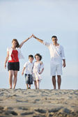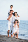 szczęśliwa młoda rodzina baw się na plaży o zachodzie słońca