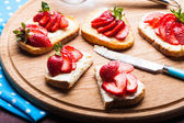 Kobieta robi letnią kanapkę z truskawkami. Samice wkładają plastry dojrzałej czerwonej truskawki na grzankę z serem stracchino. Zdrowe odżywianie, dieta owocowa brunch.