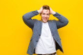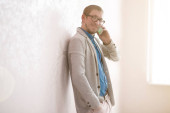 szczęśliwy młody człowiek w sweter siedząc na schodach przed domem