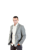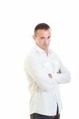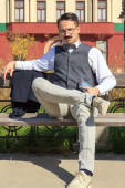 człowiek z okulary i wąsy w garnitur, siedząc w starym drewnianym