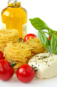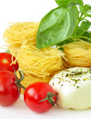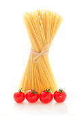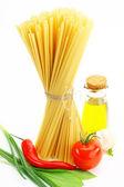 spaghetti z pomidorami, grzyby, czosnek i oliwki