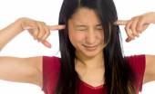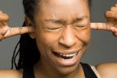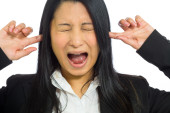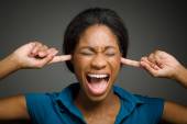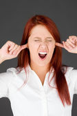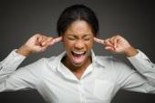 Sfrustrowany młody interesu krzyczeć z palcami w uszach