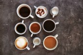 Zestaw z filiżankami gorącej kawy aromatycznej na białym tle, widok z góry