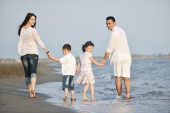 szczęśliwa młoda rodzina baw się na plaży o zachodzie słońca