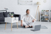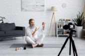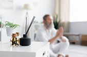 trener jogi regulacja aparatu cyfrowego w pobliżu aromatycznych pałeczek i olejów aromatycznych w domu