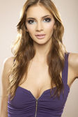 sexy brunetka pozowanie w sukienka fiolet.