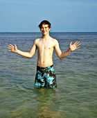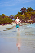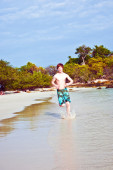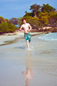 młody chłopak z czerwone włosy w strój kąpielowy jest biegnącej wzdłuż pięknej plaży