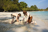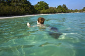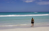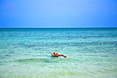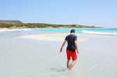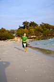 młody chłopak z czerwone włosy w strój kąpielowy jest biegnącej wzdłuż pięknej plaży