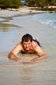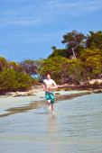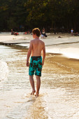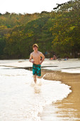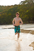 młody chłopak z czerwone włosy w strój kąpielowy jest biegnącej wzdłuż pięknej plaży