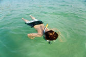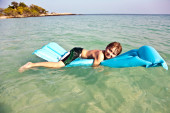 Young boy enjoys riding on the surfboard in the beautiful sea