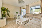 Zdjęcie "Shabby drewniany stół z krzesłami i wazon znajduje się w pobliżu wygodnej kanapy przed lekkimi ścianami z dekoracjami w nowoczesnym apartamencie" może być wykorzystywane do celów osobistych i komercyjnych zgodnie z warunkami zakupionej licencji Royalty-free. Obraz jest dostępny do pobrania w jakości wysokiej rozdzielczości do 5760x3840.
