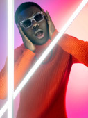 Kolorowi ludzie. Moda uliczna. Styl miejski. Futurystyczny klub nocny. cool wesoły człowiek model pozowanie w stylowy strój żywy świecący neon w nocy.