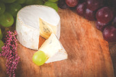 Śmierdzący ser camembert na drewnianym stole rustykalny z raspberrie