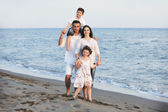 szczęśliwa młoda rodzina baw się na plaży o zachodzie słońca