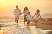 szczęśliwa młoda rodzina baw się na plaży o zachodzie słońca