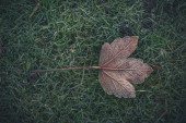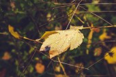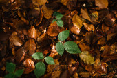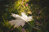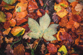 Liść klonu na szczycie stosu w lesie w jeden dzień jesienią