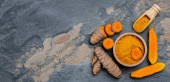 kurkuma lub korzeń kurkuminy. Kurkuma w proszku i świeża kurkuma. na konkretnym tle. Przyprawa, naturalne zabarwienie, medycyna alternatywna. widok z góry.