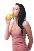 portret szczęśliwy uśmiechający się kobietę picie świeżego soku pomarańczowego