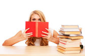 uczeń kobieta z dużą ilością książek nauki do egzaminów.