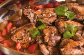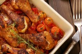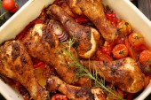 Pieczone pałki kurczaka z warzywami w rondlu na drewniane