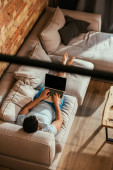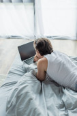 widok z góry młody Afroamerykanin człowiek z farbowanych włosów za pomocą laptopa podczas siedzenia na łóżku