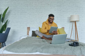 szczęśliwy Afroamerykanin uśmiecha się podczas rozmowy na smartfonie i pisania w notebooku w pobliżu laptopa na łóżku