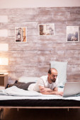 brodaty Afroamerykanin człowiek w słuchawce bezprzewodowej za pomocą laptopa i pracy z domu w łóżku