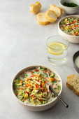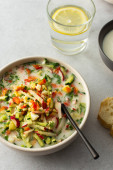 Zdjęcie "Zimna zupa Okroshka, zupa ze świeżymi warzywami i kefirem, pyszna letnia tradycyjna ukraińska lub rosyjska zupa" może być wykorzystywane do celów osobistych i komercyjnych zgodnie z warunkami zakupionej licencji Royalty-free. Obraz jest dostępny do pobrania w jakości wysokiej rozdzielczości do 5760x3840.
