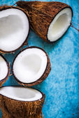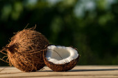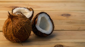 Dojrzała dziura i pół pokrojony kokos na starym drewnianym tle. Krem kokosowy i olej kokosowy.