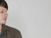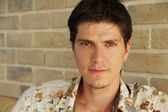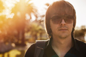 Przystojny mężczyzna ubrany w okulary na palmy zachód zewnątrz w s