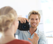 Zdjęcie "Młody fotograf fotografowania modelu poza" może być wykorzystywane do celów osobistych i komercyjnych zgodnie z warunkami zakupionej licencji Royalty-free. Obraz jest dostępny do pobrania w jakości wysokiej rozdzielczości do 5760x3840.