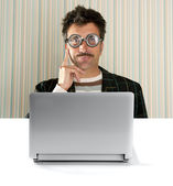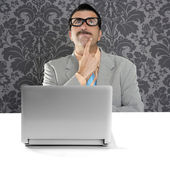 Degenerat człowiek siedzieć laptop komputer ok pozytywny gest