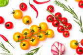 Żółte i czerwone pomidory, ostra papryka, rozmaryn i przyprawy na białym tle, baner spożywczy, widok z góry, przestrzeń do kopiowania