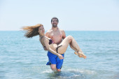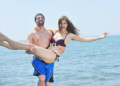szczęśliwy młody para mieć romantyczny czas na plaży