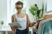 Skoncentrowana młoda kobieta pracuje nad nową kolekcją mody w biurze kreatywnym