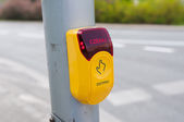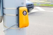 Przycisk przejścia dla pieszych z zamazaną ulicą. Zamknij żółty przycisk skrzyżowania na ulicy w Niemczech.
