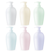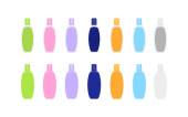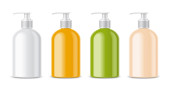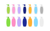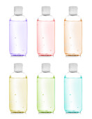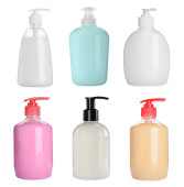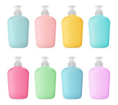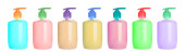 Zestaw z butelkami wielobarwnego mydła na białym tle