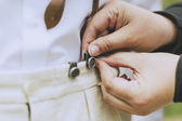 Klęczący mężczyzna w garniturze z książką między ramieniem i kolanem na niewyraźnym tle