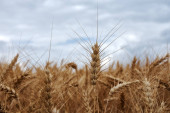 Widok z przodu kłosów zboża, pszenicy lub żyta z rozmytym tłem i błękitnym niebem w letni dzień
