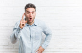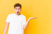 młody biały mężczyzna odizolowany na beżowym tle wskazując górę z otwartymi ustami.