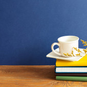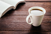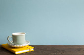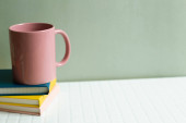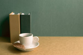 Filiżanka kawy i notatnik na białym biurku. khaki zielony ściany tło