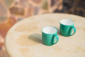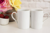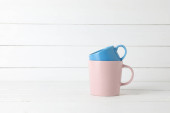 Niebieski kubek i kwiaty na drewnianym stole pod białą ścianą