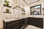 Zdjęcie "Home wystrój wnętrz nowoczesny apartament na poddaszu z otwartą kuchnią w minimalistycznym stylu i przestronnej jadalni ze stołem i krzesłami" może być wykorzystywane do celów osobistych i komercyjnych zgodnie z warunkami zakupionej licencji Royalty-free. Obraz jest dostępny do pobrania w jakości wysokiej rozdzielczości do 5760x3840.